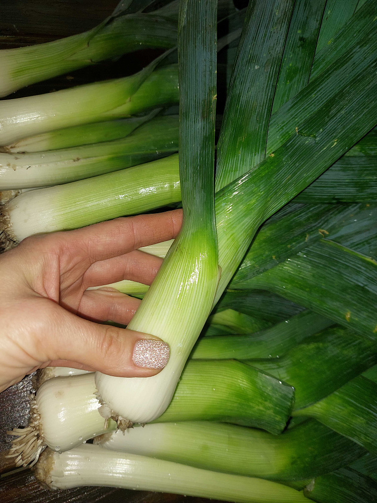 Позднеспелый лук порей убирают пред самыми заморозками. У собранных растений удаляют поврежденные и грязные листья, подрезают корни до длины 1 см и примерно на одну треть листья.