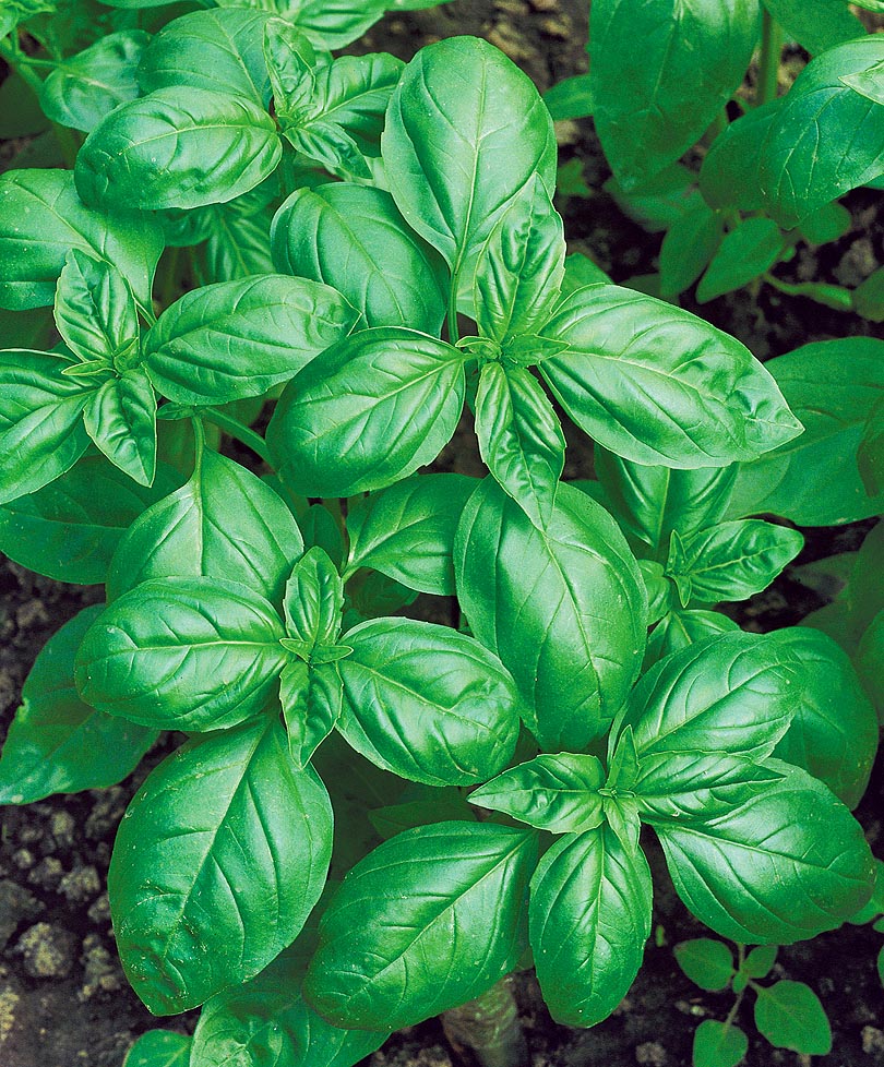 Куст компактный, полураскидистый, хорошо облиственный. Листья большие, слабопузырчатые, зеленого цвета, ароматные, нежные. Вкус мягкий, терпкий. Отлично подходит для песто и засушки.