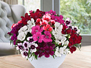 Самые крупные, 8-10 см (!), из всех гвоздик этого типа с исключительной формой цветка. Стебли настолько густо покрыты цветками, что листьев практически не видно. Потрясающий, поистине королевский цветовой контраст. Габитус компактный, до 25 см в ширину. Лучше всего проявляет себя в прохладную погоду.