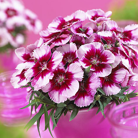Самые крупные, 8-10 см (!), из всех гвоздик этого типа с исключительной формой цветка. Стебли настолько густо покрыты цветками, что листьев практически не видно. Потрясающий, поистине королевский цветовой контраст. Габитус компактный, до 25 см в ширину. Лучше всего проявляет себя в прохладную погоду.