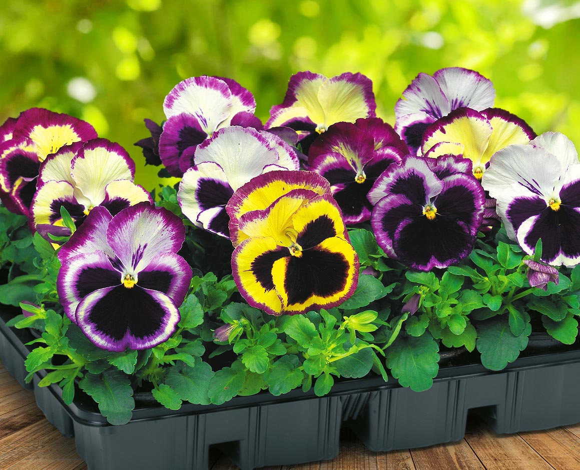 Сорт отличает устойчивость при выращивании даже в стрессовых условиях. Компактные кусты с цветками до 7,5 см с разноцветными лепестками. Белые, жёлтые и розовато-лиловые, с более тёмными краями и забавной мордочкой посередине.