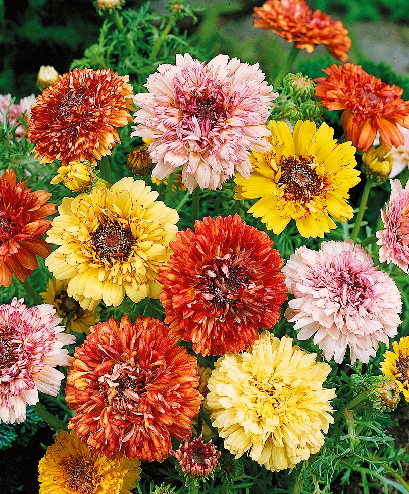 Смесь простых и махровых соцветий ярких окрасок: красных, жёлтых, оранжевых, розовых, белых. Цветение продолжительное, с конца июня до заморозков. Цветы душистые, крупные, до 7 см в диаметре. Идеальны в любых цветниках и букетах.