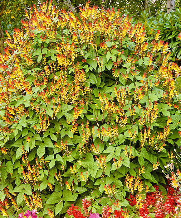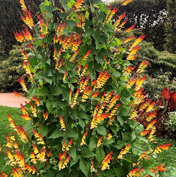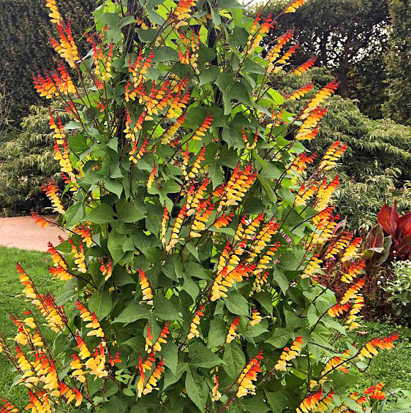 Очень эффектная лиана с сильными красноватыми стеблями.Примечательна своими необычными каплевидными цветками длиной до 2 см, собранными в односторонние колосовидные соцветия. На одном соцветии бывает до 12 цветков разной окраски!