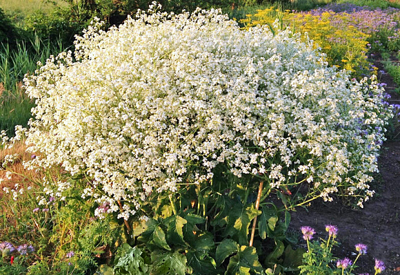 Множество белоснежных небольших цветков образует могучие эффектные соцветия. Растение очень воздушное, заметное, будет отличным