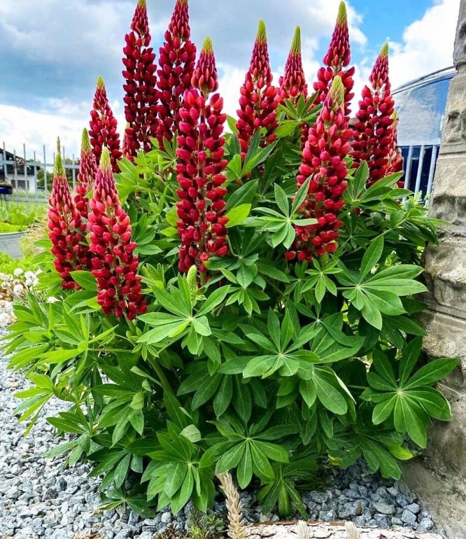 Эффектные одноцветные гибриды люпина Рассела особенно хороши в групповых посадках на газоне или массивами на дальнем плане. Растения мощные, с красивыми пальчато-сложными листьями, в зелени которых очень выразительные яркие плотные многоцветковые соцветия длиной до 45 см с крупными цветками размером около 2 см на строго вертикальных цветоносах.