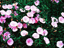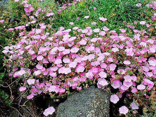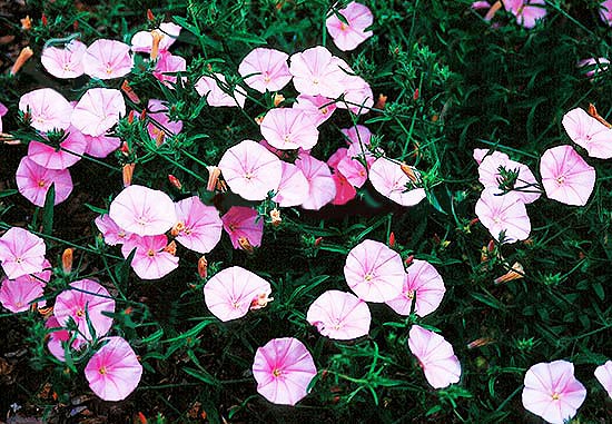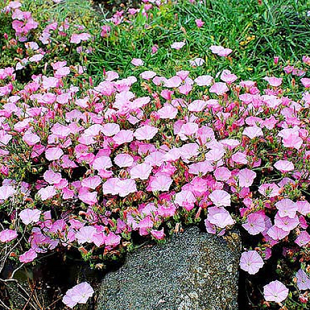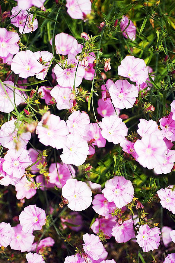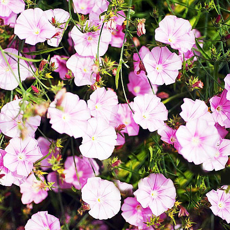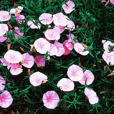 Нежно-розовые плиссированные граммафончики цветов раскрываются рано утром, а на ночь закрываются. Растения вьющиеся. Украсят альпийскую горку, задекорируют сетчатый забор. Первые цветы появляются в год посадки,
