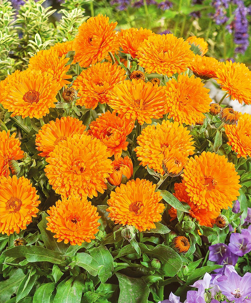 Календула хороша тем, что ею можно заполнить любые пустоты, случайные промежутки на клумбах и грядках. Она даёт роскошные жёлтые пятна разных оттенков. Календула не любит пересадку, её сеют сразу на постоянное место. Когда большая часть растения отцветёт, срежьте куст на 2/3 высоты, подкормите, порыхлите почву, и через две недели он снова благодарно зацветёт.