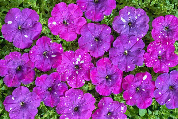 УХОД ЗА ПЕТУНИЕЙ В ГРУНТЕ. Уход за петунией в грунте заключается в регулярных умеренных поливах. В прополках и рыхлении она нуждается до того момента, пока она не заполнит собой сплошным ковром весь отведенный ей участок. Отцветшие цветки нужно своевременно удалять и за сезон несколько раз провести стрижку растений, после каждой стрижки петуния порадует вас вновь обильным кущением и цветением. Подкормки петунии, растущей в грунте в цветниках, нужны раз в 20 -30 дней любым минеральным комплексом для цветочных культур, предпочтительнее кормить по листу. Для петунии в клумбах с ограниченным объемом грунта, например клумба в шине, питание дают раз в 10 -14 дней. Для петуний, высаженных в небольшие кашпо или цветочные горшки, питание дают раз в 7 дней. Объем грунта в цветочном кашпо слишком мал, что бы надолго обеспечить обильное цветение без подкормок. Ампельные петунии любят покушать чаще всех, их кормят раз в 5 дней.