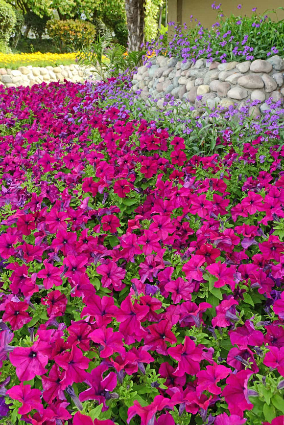 УХОД ЗА ПЕТУНИЕЙ В ГРУНТЕ. Уход за петунией в грунте заключается в регулярных умеренных поливах. В прополках и рыхлении она нуждается до того момента, пока она не заполнит собой сплошным ковром весь отведенный ей участок. Отцветшие цветки нужно своевременно удалять и за сезон несколько раз провести стрижку растений, после каждой стрижки петуния порадует вас вновь обильным кущением и цветением. Подкормки петунии, растущей в грунте в цветниках, нужны раз в 20 -30 дней любым минеральным комплексом для цветочных культур, предпочтительнее кормить по листу. Для петунии в клумбах с ограниченным объемом грунта, например клумба в шине, питание дают раз в 10 -14 дней. Для петуний, высаженных в небольшие кашпо или цветочные горшки, питание дают раз в 7 дней. Объем грунта в цветочном кашпо слишком мал, что бы надолго обеспечить обильное цветение без подкормок. Ампельные петунии любят покушать чаще всех, их кормят раз в 5 дней.