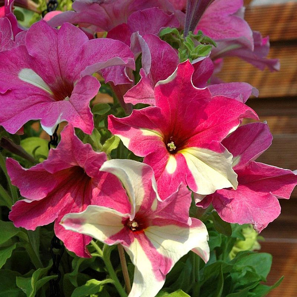 Эта группа занимает лидирующие позиции! Наибольшая гордость крупноцветковой петунии (грандифлора) — это крупные (диаметр 9-13 см!) цветы, простые или махровые с волнистыми краями, окрас от нежных пастельных оттенков до броских цветовых сочетаний. Куст пышный, ветвистый. Отличается ранним, обильным и продолжительным цветением.