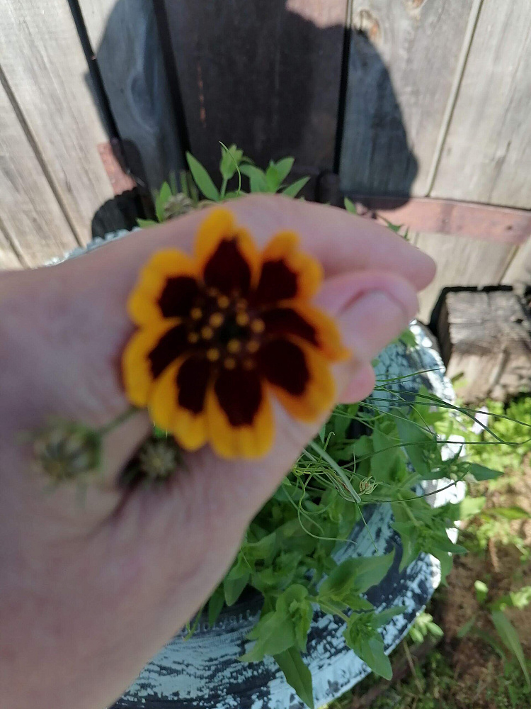взошла одна былиночка, цветочек сам по себе маленький, зелени практически нет, носилась с этой былиночкой куда посадить, пристроила в колеса с флоксами, сам цветочек прикольный, но один в поле не воин, если садить то только кустом, чтобы поддержка была. Я люблю все растюшки, но от этого цветочка смешанные чувства, пожалеть его хочется такой он задрыга никакой.