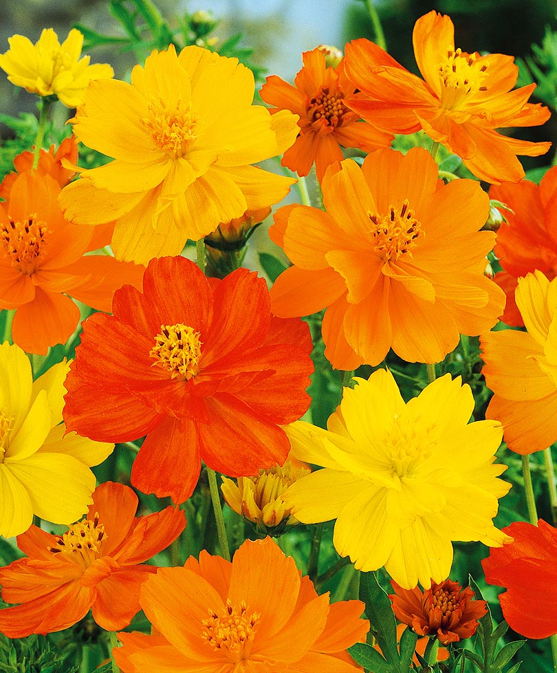 Махровые цветы золотистого, кирпичного, оранжевого оттенков. Космос скроет забор и некрасивый фундамент. Подойдёт для заднего плана бордюра, будет хорошим солитером на газоне. Выращивается посевом в грунт.