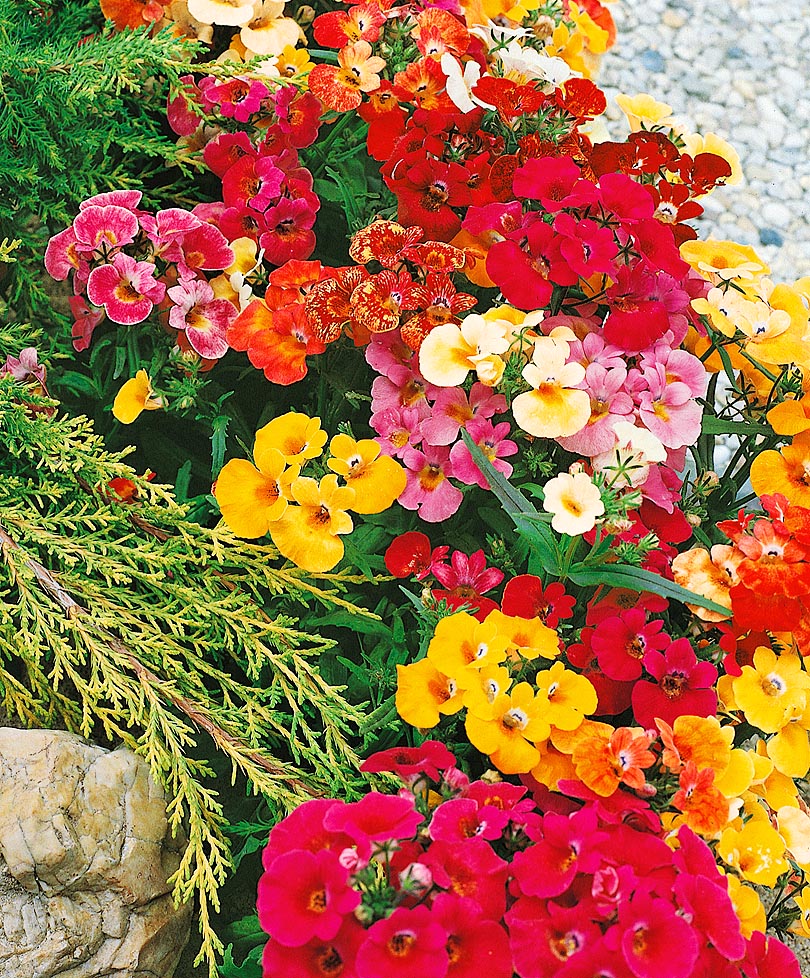 Немезия — просто загляденье! Небольшое сильноветвистое растение усыпано оригинальными по форме, мелкими, всего 1-1,5 см в диаметре, цветками так плотно, что листьев почти не видно. Она необыкновенно красива и привлекательна в бордюрах, пятнами на газонах, в горшках и садовых корзинах. Цветёт с июня по сентябрь.