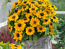 Многочисленные солнечно-желтые цветки до 10 см! в диаметре с круглой коричневой серединкой эффектно смотрятся на компактных кустах. Кусты хорошо ветвящиеся, с приятным ароматом. Цветет весь сезон.