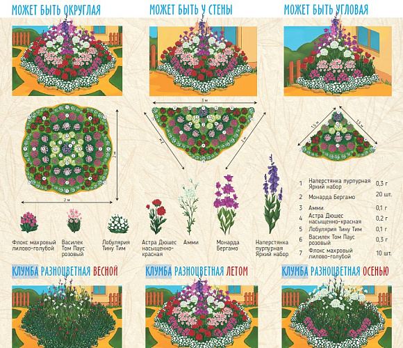 Для каждого лето — свое, совершенно особенное, и сад у каждого уникальный и не похожий на другие. Нашу разноцветную клумбу вы можете посадить в углу, у стены дома или в центральной части участка. А мы подскажем вам как. Выбирайте расположение и следуйте схемам посадки.