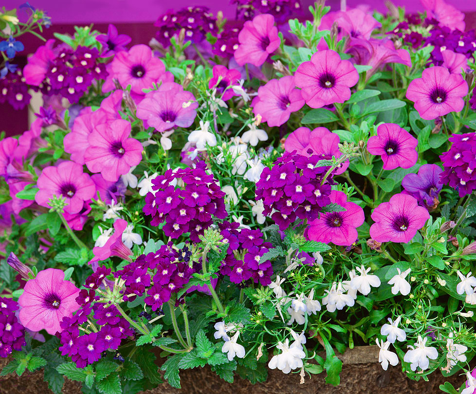 Композиция из крупных розово-лиловых петуний и фиолетовых вербен в окружении свежей зелени и белых мелких цветочков лобелии выглядит очень аристократично. Разветвленные ниспадающие побеги, сплошь покрытые душистыми цветами, привлекают бабочек. Смесь идеально подходит для подвесных кашпо или высоких контейнеров, расположенных в солнечном месте. Все растения этого набора засухоустойчивы, однако в сильную жару им необходим ежедневный полив.
