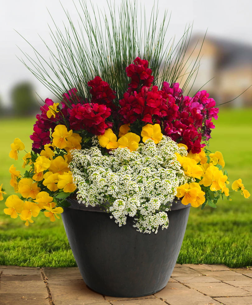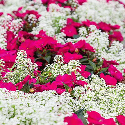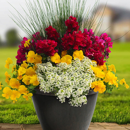 Пламенная игра закатных цветов, которые одновременно борются и подчеркивают друг друга. Стебли ситника как лучи солнца, лобулярия – белые облака, а львиный зев и виола – расцвеченное закатом или восходом летнее небо. Композицию отмечает не только потрясающая красота, но и деликатный нежный аромат. Разместите ее в любимом солнечном уголке сада или перед входом в дом, оформите с ее помощью балкон или открытую террасу. Цветение продлится в течение всего сезона до заморозков, при условии срезки отцветших соцветий львиного зева.