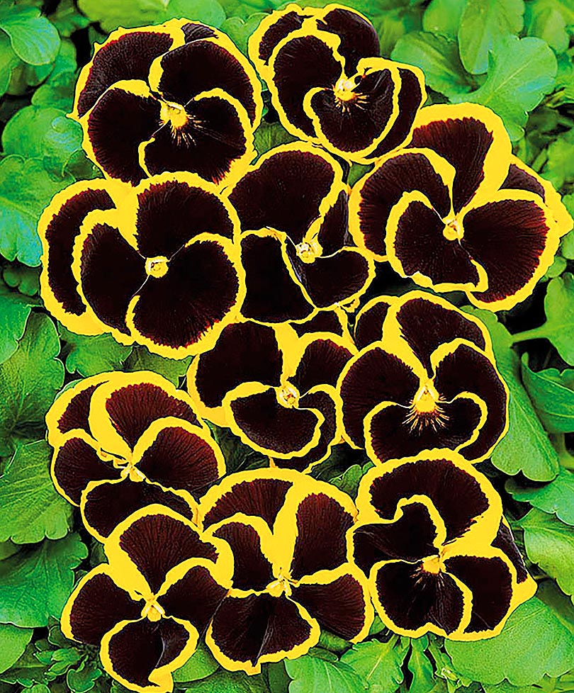 Восхитительная гармония контраста. Цветки бесподобно выразительные с бархатисто-чёрными лепестками, окантованными золотистой каймой. Высота 18-20 см.