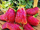 Как вложить в слова и донести до вас волшебный суперинтенсивный вкус и аромат? Пожалуй, будет правильнее дать вам возможность попробовать этот легендарный гибрид второго поколения крупноплодной садовой земляники (fragaria ananassa) и клубники мускатной (fragaria moschata). Мякоть плотная, сладкая, с ярко выраженным ароматом муската (дегустационная оценка 5 баллов из 5 возможных!). Вкус и аромат сохраняются даже после затяжных дождей. Урожай поистине купеческий: уже в первый год куст дает более 10 цветоносов, а это означает, что во время плодоношения на 1 кусту может одновременно находиться до 200 плодов, длиной 3-4 см! Ягоды темно-красного цвета, в полной спелости с легким фиолетовым оттенком, характерной неправильной лопато- или гребнеобразной формы с многонадрезанным кончиком. Очень хорошо держат форму, не мокнут, не гниют, поэтому долго хранятся.