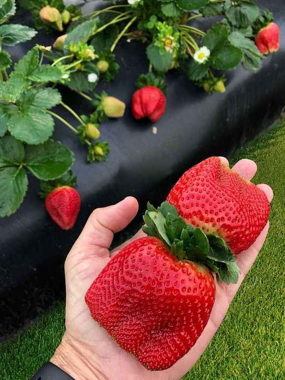 Сверхкрупноплодная садовая земляника. Самые крупные ягоды созревают в 1-й год плодоношения – масса достигает 100–150 г! Потом несколько мельчают, до 50–80 г, но их становится намного больше – урожайность 1,3–1,5 кг с куста. Вкус просто восхитительный! Сладкий, очень напоминает лесную землянику. Плоды гребневидные, мясистые и упругие. Мякоть красная, сочная и сладкая. Сорт устойчив к основным заболеваниям земляники. Рекомендуемая посадка 50 × 50 см. Зимостойкость под снегом до −35 ºC.