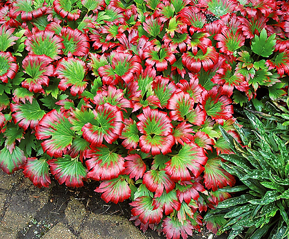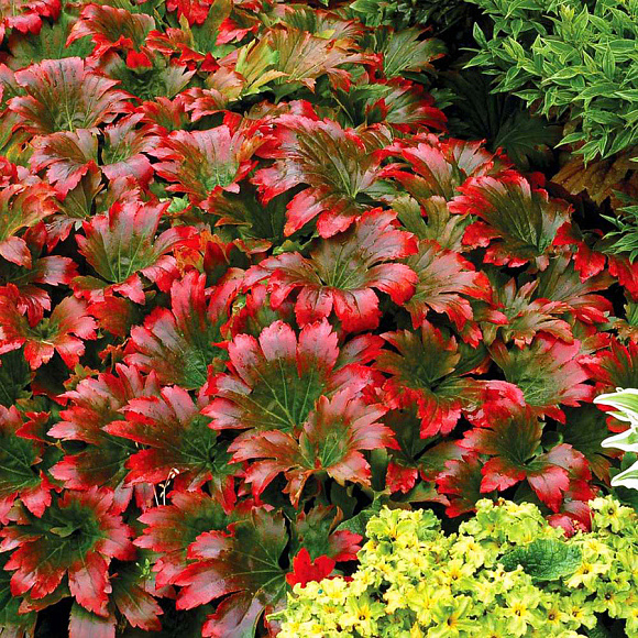 Всегда красивое и яркое благодаря расцветке и форме листьев невысокое растение. Их окраска меняется в течение сезона от красно-бронзовой весной до зелёной — летом, а осенью становится пурпурно-красной по краям. Листочки мелкие, с сильнорассечёнными краями, блестящие. Высота растения 30 см, в момент цветения — до 40 см, за счёт длинных цветоносов с нежными цветками в виде звёздочек. Несмотря на свой экзотический вид, растение очень неприхотливо, зимует без укрытия.
