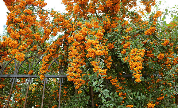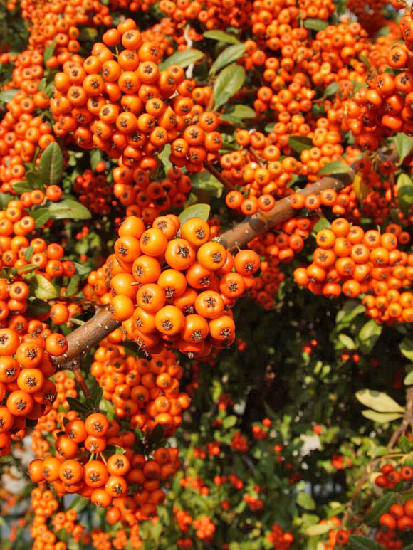 Название «pyracantha» происходит от греческих слов pyros (огонь) и acantha (шип), что переводится как «огненный шип» (или «горящий куст», упоминаемый в Библии). Один из самых декоративных кустарников в зимний период. Форма раскидистая, ветви прямостоячие с блестящей кожистой листвой ярко-зеленого цвета. Если их не обрезать, изящно падают под тяжестью роскошных гроздей оранжево-красных ягод. Их обилие поражает! Они сохраняются на растении до весны. Кустарник удивительно вынослив, не боится ни засухи, ни бедной почвы, ни городских условий выращивания. Создает непроходимую живую изгородь. Зимостойкость до −30 °С.