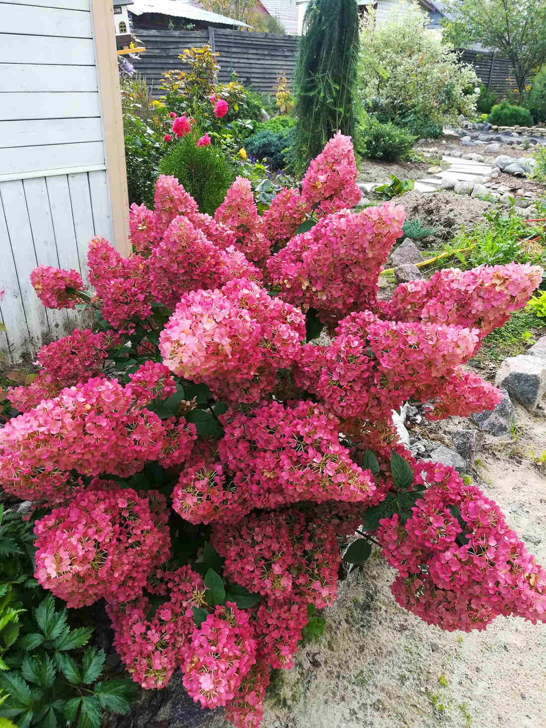 Великолепный сорт был создан на основе знаменитой гортензии Ванила Фрайз. У Сандэй Фрайз такие же огромные (до 35 см в длину) бело-розовые конусовидные соцветия, постоянно меняющие цвет от бело-розового до яркого красно-малинового, но очень компактный размер куста – в среднем до 1 м (идеально для обладателей небольших садовых участков). Этот сорт улучшен по нескольким параметрам: помимо своего невысокого роста, куст абсолютно терпим к отсутствию света, безразличен к загазованному воздуху, а также практически не болеет и имеет очень высокую зимостойкость (до -36°С).