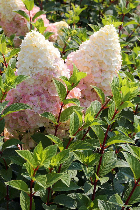 Сорт уровня победителей! Жемчужина среди метельчатых гортензий. Неоднократный призер цветочных выставок. Пышный полураскидистый кустарник с прочными побегами не полегает, достойно держит огромные конусовидные цветущие шапки длиной 25 см! В июле раскрывающиеся бутоны имеют нежно-зеленый оттенок, затем становятся белоснежно-серебристыми, а осенью приобретают легкую розоватость. Растение зимостойкое, устойчиво к болезням, не требует подвязки.