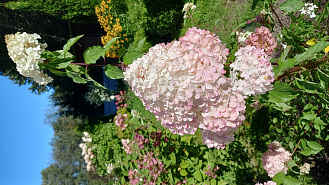 Гортензия растет третий год. На зиму засыпаю хвойным опадом корни и закрываю спанбондом, ранней весной открываю. Цветет второй год, красивыми крупными шапками, очень красиво. Зацвела в конце июня и сейчас, в августе, радует бело -розовыми цветами. Часто поливаю, так как начало лето было очень засушливое, особого ухода не требует, изредка подкармливаю, без фанатизма. Одна из любимых, наряду с Фрайз мелба