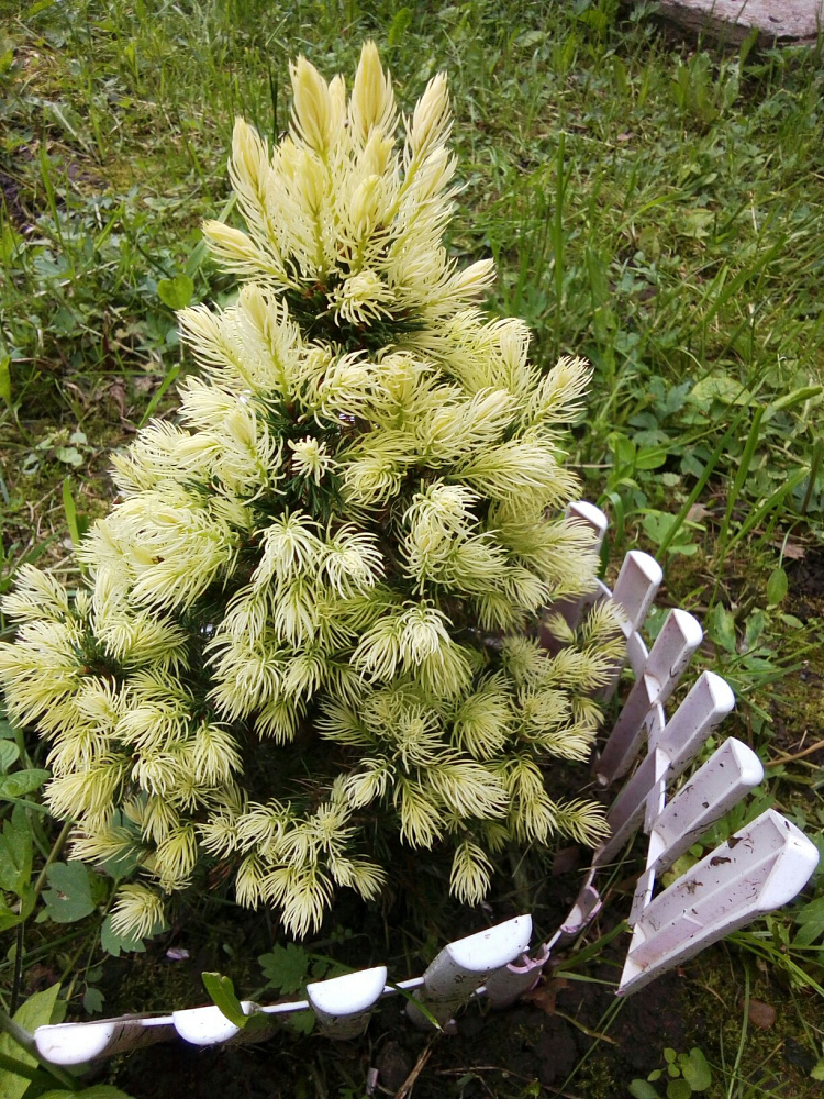 Растут три елочки. Фото на второй год после посадки. Очень медленно растут, уже 6 лет как посадили, выросли на 6-7 сантиметров. Весной очень красивые, сначала белые очень долго, потом постепенно меняют цвет на желтый и к середине лета становятся зелеными. Очень эффектные, красивые!