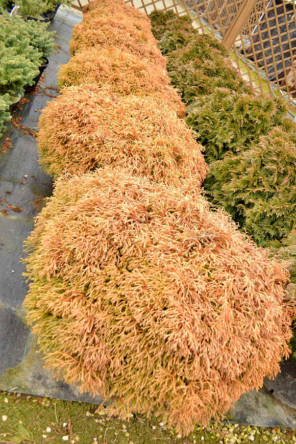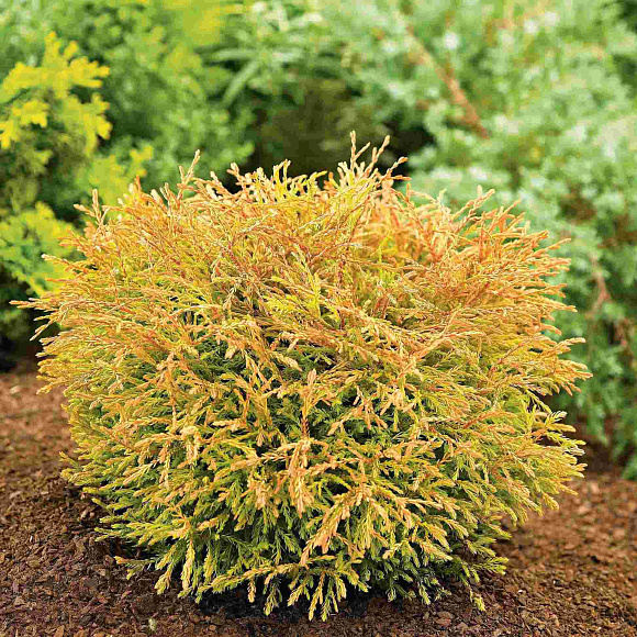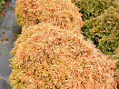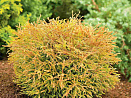 Шаровидная туя – «золотой холмик» с теплым медовым оттенком кроны. Хвоя ажурная, чешуйки не плотно прижаты к побегам, из-за чего куст кажется более пушистым. Очень медленнорастущая. После 10 лет вегетации достигает всего 60 см в высоту и менее метра в ширину. Слишком сухое и тенистое место становится причиной потери декоративности.