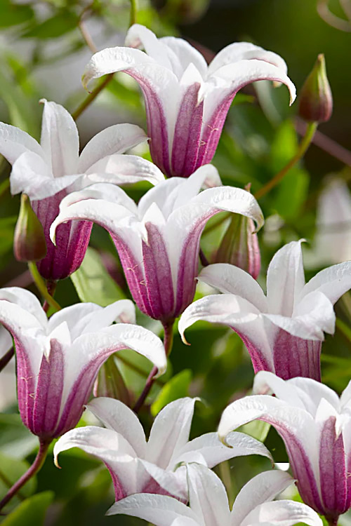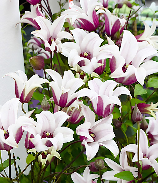 Необычный сорт с изящными тюльпановидными бело-пурпурными цветками. Каждый вечер они превращаются в бордовые бутоны. Цветет обильно и продолжительно на побегах текущего года. Осенью и зимой лиана покрыта декоративными соплодиями. Зимостойкость до −35 °С.
