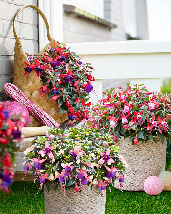 Яркие модные новинки среди прямостоячих кустовых гибридов фуксий. Габитус компактный, хорошо разветвленный. Цветки крупные, махровые, насыщенных оттенков, без устали распускаются все лето напролет. Фуксии любят воду. Если день выдался очень жарким, следите за тем, чтобы почва была влажная. При первых похолоданиях ниже +10 °С растение необходимо занести в помещение. Чтобы подготовить его к зимовке, рекомендуем постепенно сократить полив, прекратить внесение удобрений и переместить вазон с растением в прохладное помещение с температурой воздуха 10−15 °C. Если вы планируете оставить фуксию на зимовку в погребе или в гараже, можно утеплить вазон пенопластом или поставить его в ящик с опилками. К свету фуксия в этот период безразлична. Но если же оставить ее в хорошо отапливаемом помещении, то по весне буйного цветения ждать не придется. Также перед зимовкой рекомендуем обрезать растение и истребить вредителей.