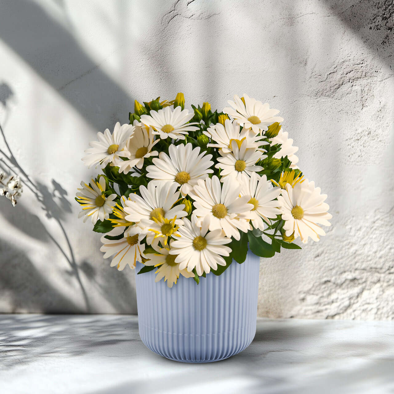 Селекционный прорыв! Потрясающе эффектные компактные крупноцветковые мини-остеоспермумы. Внешне имеют некоторое сходство с ромашками, однако в отличие от последних невероятно обильно цветут большими постоянно обновляющимися цветками 5–6 см в диаметре. За счет плотного, хорошо разветвленного габитуса и жестких побегов кусты отлично держат форму и практически не повреждаются неблагоприятной погодой и вредителями. Цветут без остановки на протяжении всего сезона до самых заморозков. Подходят для выращивания дома и в саду. Рекомендуемый диаметр горшка 10–15 см.