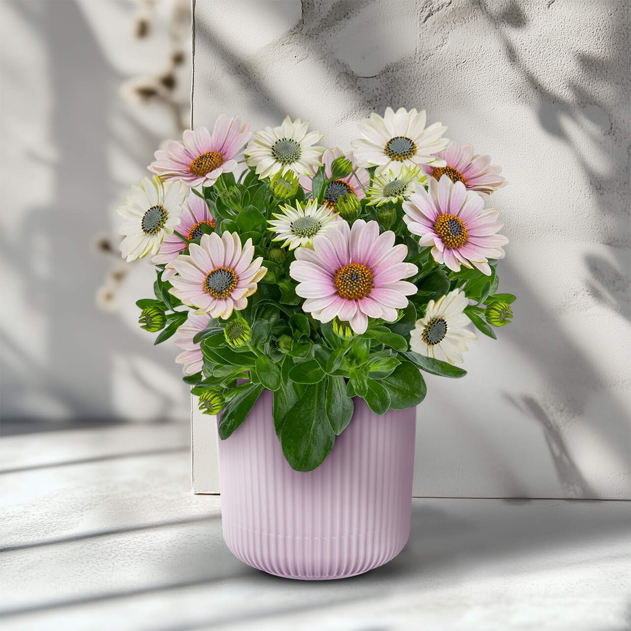 Селекционный прорыв! Потрясающе эффектные компактные крупноцветковые мини-остеоспермумы. Внешне имеют некоторое сходство с ромашками, однако в отличие от последних невероятно обильно цветут большими постоянно обновляющимися цветками 5–6 см в диаметре. За счет плотного, хорошо разветвленного габитуса и жестких побегов кусты отлично держат форму и практически не повреждаются неблагоприятной погодой и вредителями. Цветут без остановки на протяжении всего сезона до самых заморозков. Подходят для выращивания дома и в саду. Рекомендуемый диаметр горшка 10–15 см.