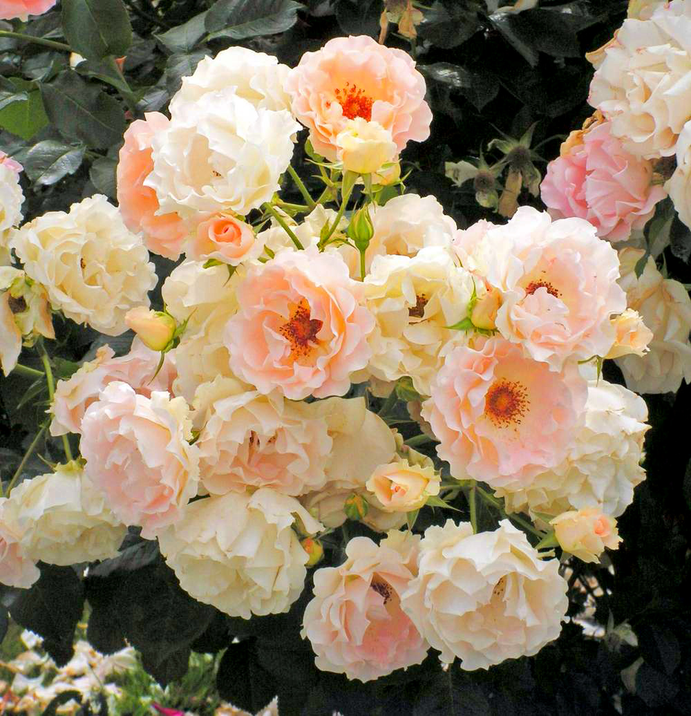 Эта роза как будто создана для дворцовых интерьеров. Золотисто-абрикосовые бутоны плавно переходят в изящные бокаловидные цветки. По мере роспускания в них начинают преобладать нежно-розовые и жемчужные оттенки. В центре волнистых шелковых лепестков, на фоне желтой подсветки прорисовываются яркие тычинки. Диаметр цветков 8–12 см, аромат легкий. Сорт устойчив к заболеваниям, зимует с укрытием.