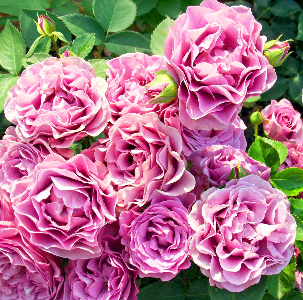 Редкая красавица с холодным цветом волнистых лепестков. В списке лучших сортов голубых роз. Цветки крупные, диаметром 8 см, махровые, сиренево-фиолетовые с сизым оттенком. На одном цветоносе распускается одновременно от 3 до 7 воланчиков, которые очень долго держат форму. Цветение обильное, длительное, до самых заморозков. Зимует с укрытием.