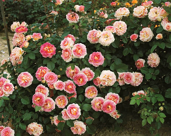 Царское величие! Великолепный сорт с роскошными густомахровыми цветками диаметром до 10 см. Распускающиеся бутоны двухцветные – бело-розовые, более насыщенные к центру, с большим количеством ажурных по краям лепестков. Каждый цветок сохраняет декоративность до 14 дней! Куст раскидистый, разрастается неповторимой красотой в ширину до 3-х метров. Цветет дважды за сезон. Шипы практически отсутствуют. Зимует с укрытием.