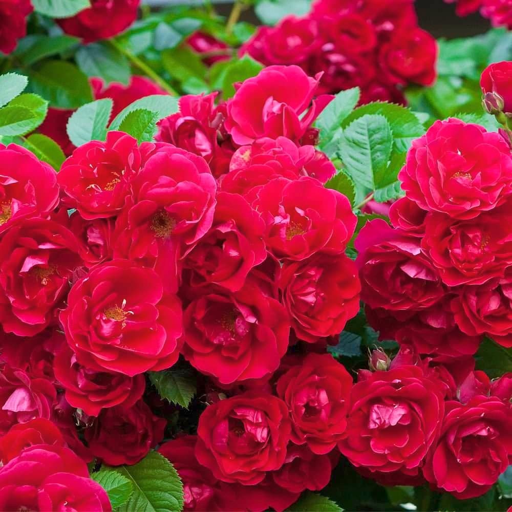 Цветов так много, что сам куст едва виден: сплошное бордово-алое воздушное облако, парящее над клумбой. Создается иллюзия какой-то нереальности и светлой радости! Соцветия собраны в крупные кисти по 15-20 шелковистых шариков. Эту сказочную красоту роза дарит до наступления первых холодов – так долго продолжается ее цветение. Растение очень выносливое, хорошо переносит засуху и морозы, растет на любой почве. С годами не теряет своей красоты, не требует укрытия на зиму.