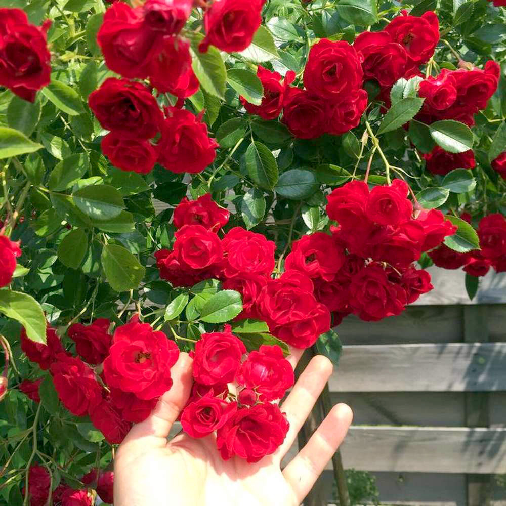 Эта красотка на ярмарке щедрости однозначно стала бы первой. Около 50 бутонов одновременно она распускает, покрывая темно-зеленую глянцевую листву куста махровыми ярко-рубиновыми цветками, диаметром 4 см. Из-за большого количества бутонов плети грациозно склоняются к земле. Активно разрастается в ширину. Неприхотлива, вынослива, не теряет декоративность после дождей. Зимует с укрытием.