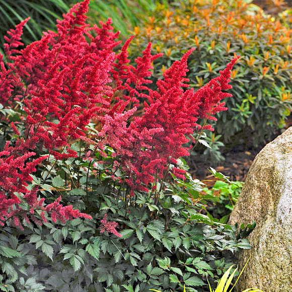 Невероятно эффектные пушистые метелки-соцветия красно-малинового цвета на фоне ажурной глянцевой листвы уже почти столетие украшают садовые и парковые ландшафты. Прямостоячие красноватые побеги добавляют растению особую декоративность. Хорошо смотрятся в срезке. Нежный сладко-медовый аромат привлекает большое количество бабочек и других насекомых-опылителей. Высаживают астильбу группами для формирования бордюров и клумб, для оживления каменистой местности, для добавления яркого акцента на фоне зеленых лиственных кустарников и хвойных деревьев. Идеальное место для посадки данного сорта – легкая полутень, особенно вблизи водоема. Влажный воздух способствует сохранению ярко выраженных цветовых оттенков на протяжении всего сезона. Не требует особого ухода, в средней полосе России прекрасно зимует под снегом.