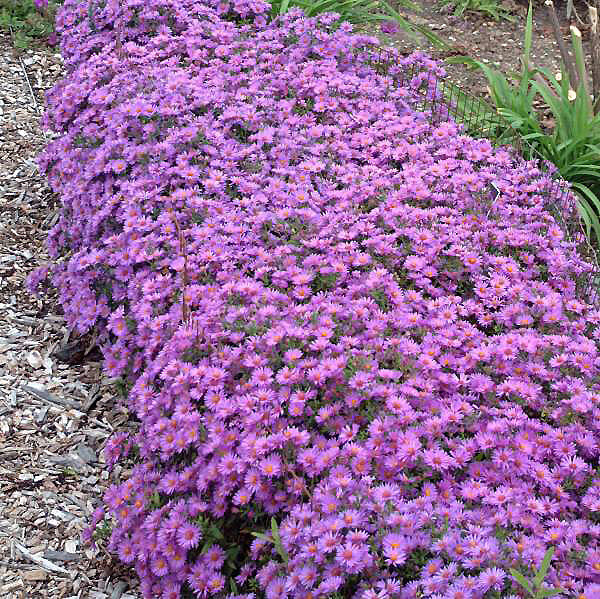 Карликовый сорт, сплошь усыпанный насыщенно-фиолетовыми полумахровыми цветками, со множеством мелких лепестков. Серединка контрастная желтая с бурыми вкраплениями. Листья темно-зеленые, зубчатые по краю. Растение формирует компактный низкорослый куст в форме полушара. Сорт неприхотлив, устойчив к мучнистой росе и ржавчине. В укрытии не нуждается.