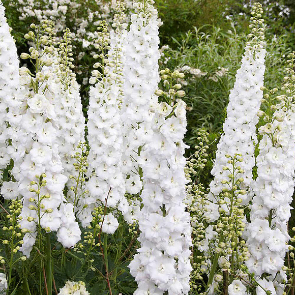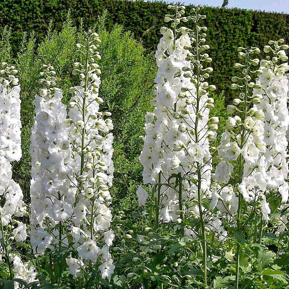 Этот дельфиниум привлекает внимание внушительными размерами и крупными махровыми белыми цветками диаметром около 7 см. Его мощные соцветия достигают длины до 80 см (!), создавая эффектные вертикальные акценты в саду. Возможно повторное, хотя и более скромное, цветение в начале осени. Галахад прекрасно вписывается в различные стили ландшафтного оформления, подходит для украшения заборов, разноуровневых клумб и создания ярких акцентов на газоне. В срезке сохраняет свежесть в течение долгого времени, что делает его отличным выбором для создания оригинальных букетов. Несмотря на крупные размеры, растение требует определенного внимания к себе: не очень хорошо переносит как длительный палящий зной, так и затяжные дожди. Зачастую садоводы выращивают его как однолетник или двухлетник. Зимостойкость –34 °С.