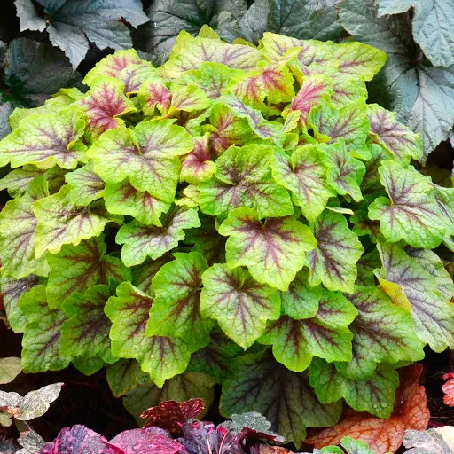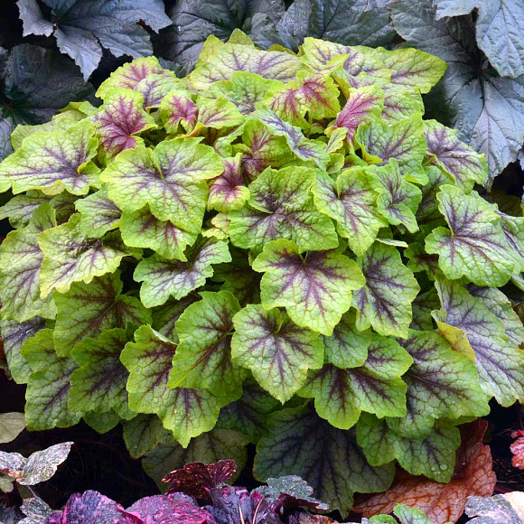Гейхерелла ФАЕР ФРОСТ Желтовато-лаймовые листья с темно-бордовыми прожилками, как будто слегка тронутые серебристым инеем. Прямостоячие стебли украшают кремово-розовые колокольчатые цветки. Максимально проявляет декоративность в групповых посадках с другими сортами гейхер.