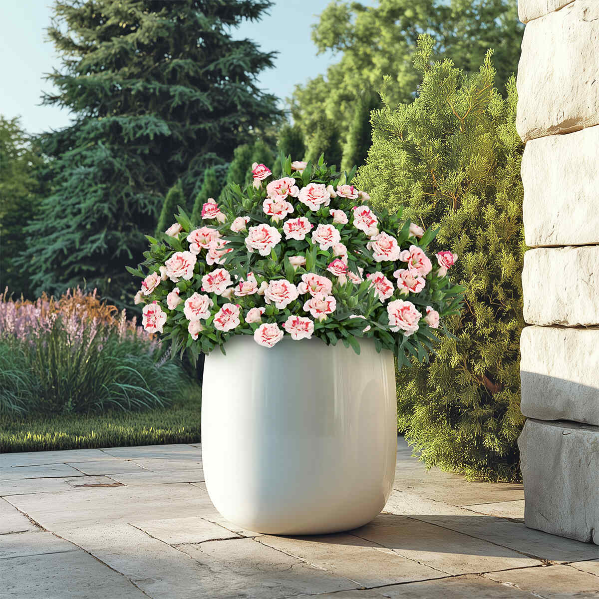 Новейшие широколистные сортосерии благоухающих компактных гвоздик. Отличаются исключительной однородностью и долговечностью. Образуют густые, хорошо разветвленные кустики, покрытые крупными махровыми душистыми цветками, диаметром 4–5 см, самых различных окрасок. Растения засухоустойчивые. Идеальное решение для контейнеров, балконных ящиков, подвесных вазонов и кашпо. Рекомендуем обильный полив раз в неделю. Отцветшие цветки прищипывать у основания. В суровом климате Урала и Сибири выращивается как однолетник.