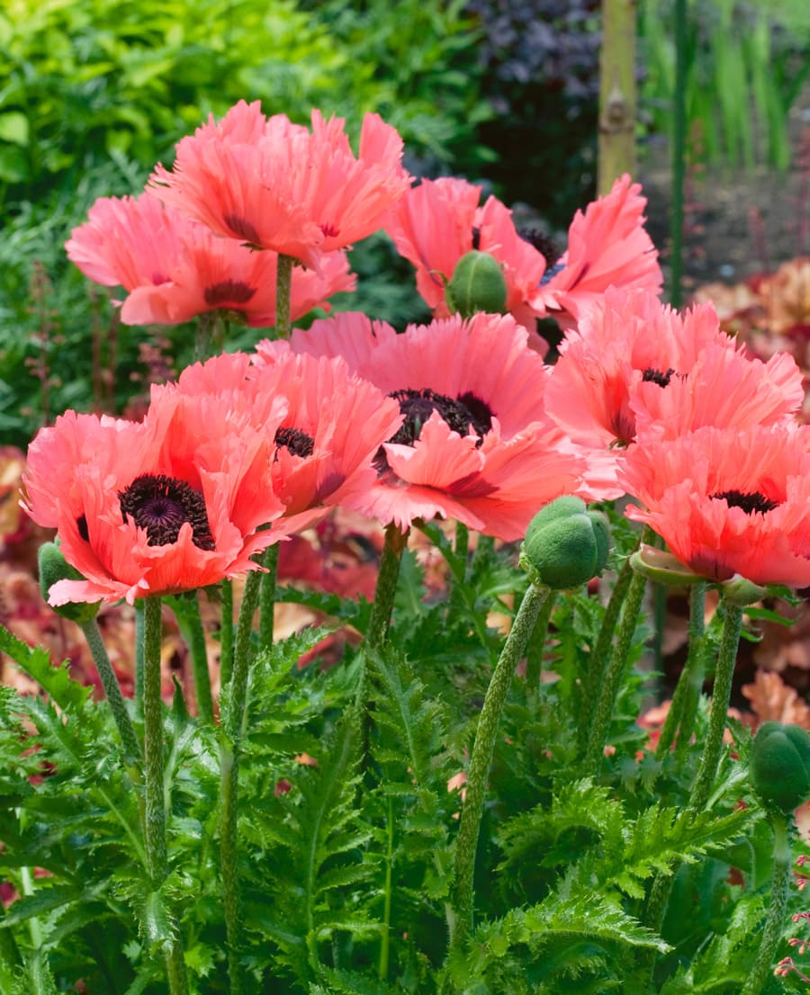 Невероятно крупные цветы до 20 см в диметре во множестве ярких оттенков. Окрас варьируется от красно-алых и лососевых тонов до нежно-розовых. Воздушные слегка гофрированные лепестки у стебля имеют характерное черное пятнышко.