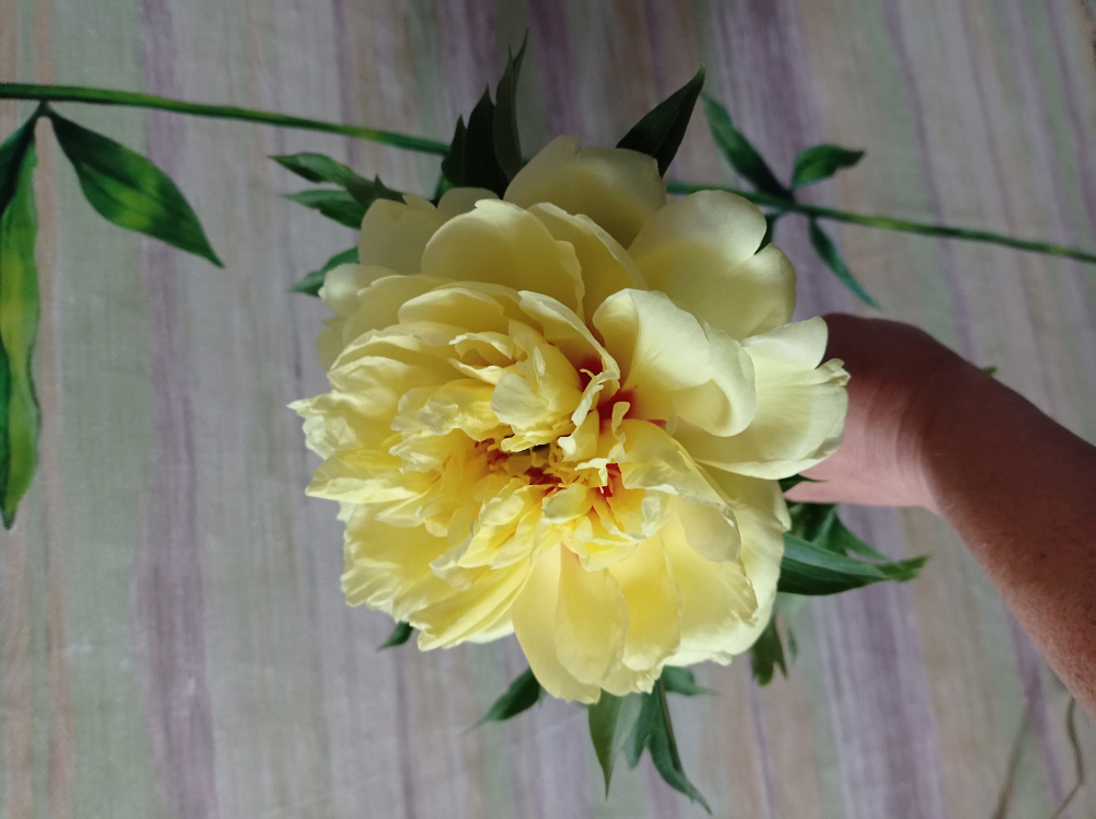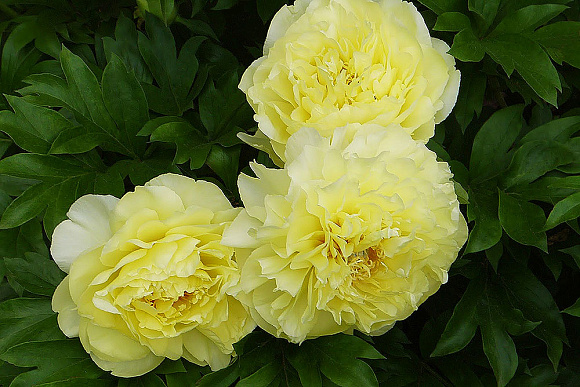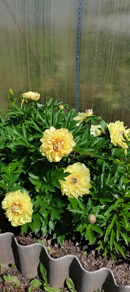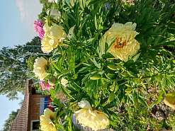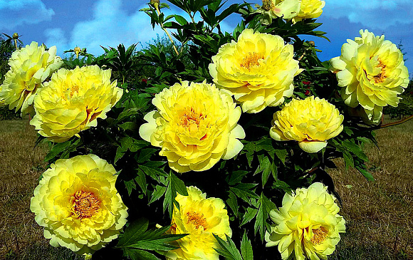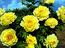 Неоднократный победитель международных выставок. Огромные махровые цветы 25 см в диаметре, редкого для пионов чайно-желтого цвета. Лепестки ближе к центру часто имеют небольшую красную искорку у основания. Приятный аромат с нотками цитрусовых. Цветение длится около месяца. Цветоносы крепкие. В срезке стоят гораздо дольше обычных пионов. Высокозимостоек.
