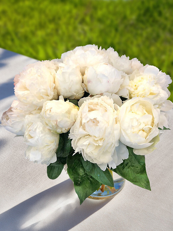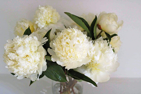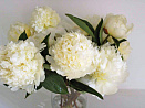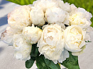Махровые, бомбовидные цветки. Расцветка лепестков варьируется от розовато-сливочных до белоснежных оттенков.