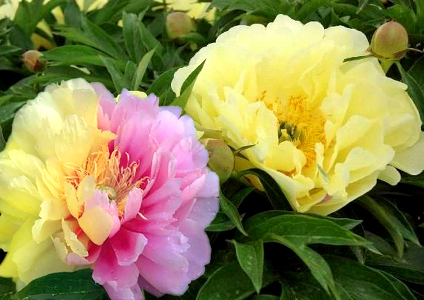 Гибрид древовидных и травянистых пионов пересек Атлантику, чтобы попасть в наши сады. Компактный куст с прочными побегами удивит вас фантазийным лимонно-розовым цветением с цитрусовым ароматом. Цветки огромные, до 25 см в диаметре, полумахровые, и каждый неповторим в своей расцветке. Одно растение за сезон выпускает до 50 желто-лиловых цветочных шапок. Зимует без укрытия. Зимостойкость −40 °С.