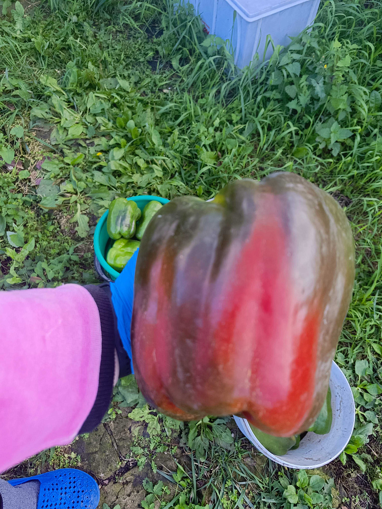 Перец ,,Кинг,, порадовал своими плодами размером с 700гр банку!На кусту выросло 4 таких перцев,один из них весит 380гр!!!